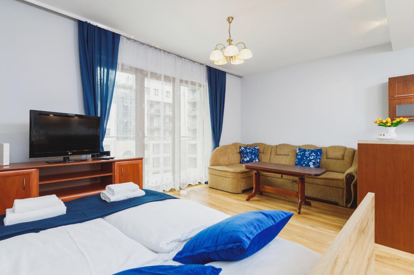 Studio z balkonem. In the well-fitted kitchenette, guests will find a stovetop, a refrigerator, a dishwasher and kitchenware. The studio offers a washing machine, a tea and coffee maker, a balcony with ancourtyard view as well as a private bathroom boasting a bath. The unit has 2 beds. Studio - 5 osobowy. Powierzchnia pokoju ok.: 40 mkw.